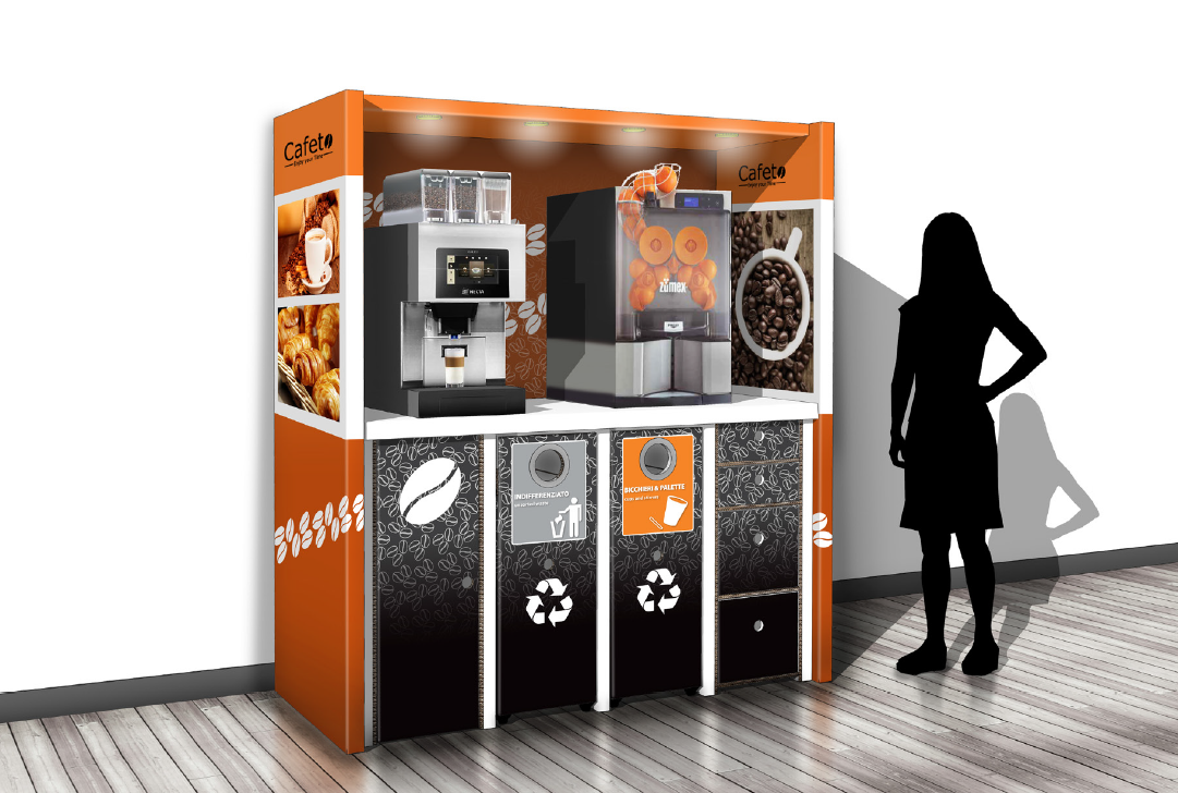 Mit dem Coffee Corner: Konzept im HoReCa-Bereich (Hotel/Restaurant/Café) aus Karton für Table Top Kaffeeautomaten by Flavura avancieren Table Top Kaffeeautomaten by Flavura zu echten Hinguckern.